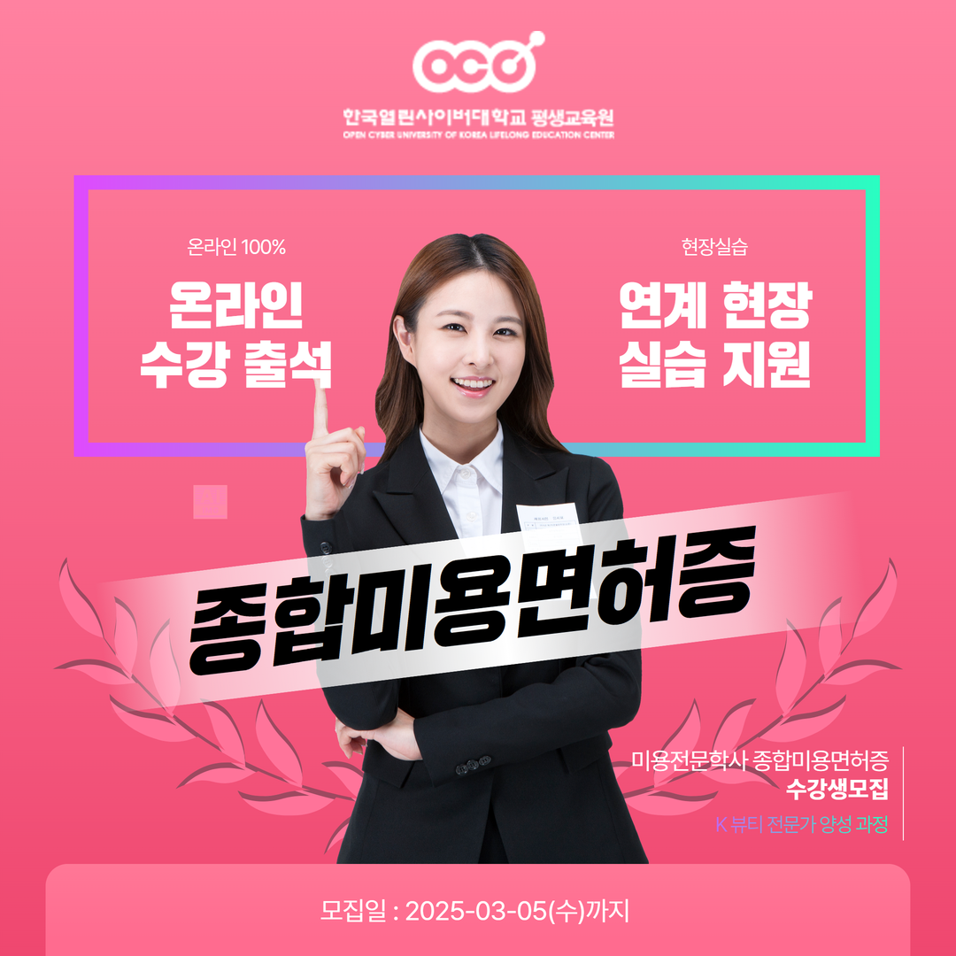한국열린사이버대학교 평생교육원에서 종합미용면허증 취득 과정을 개설하고 2025년 3월 5일까지 수강생을 모집한다. 3월 6일에 개강하는 이번 과정은 헤어, 피부, 메이크업, 네일 등 미용의 다양한 분야를 체계적으로 배울 수 있도록 구성되어 있으며, 이론과 실무를 겸비한 전문 강사진의 지도로 높은 수준의 교육을 제공한다.