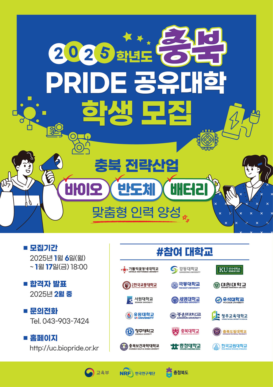 한편, 충북 PRIDE 공유대학은 충북지역 18개 대학을 기반으로 MOU협약을 통하여 학점교류 형태로 공동교육과정을 운영하고 있으며 △제약바이오 △방사광융합 △정밀의료·의료기기 △화장품산업 △천연물소재 △시스템반도체 △배터리산업 분야 등 7개 융합 전공 교육을 통한 충북 주력산업 맞춤형 인재양성을 지원하고 있다.