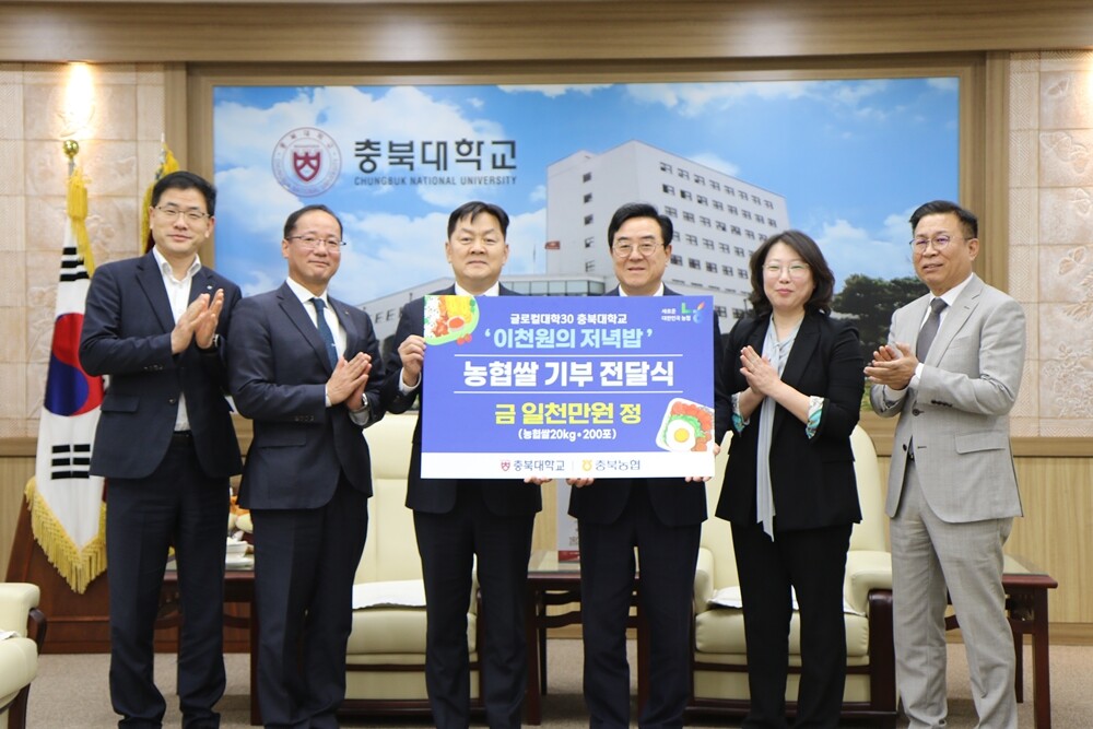 충북대는 지난 2023년부터 하루를 건강하고 든든하게 보낼 수 있도록 영양가 높은 아침과 푸짐한 저녁 식사를 저렴하게 제공하는 ‘천원의 아침밥’과 ‘이천원의 저녁밥’을 운영하고 있다. 농협은행 충북본부는 우수한 지역인재 양성에 도움이 되고자 2023년부터 충북지역에서 생산된 우수한 쌀을 지원하고 있으며, 이번 기탁식에서는 충북지역에서 생산된 쌀 4톤(20kg 200포)을 기탁했다.