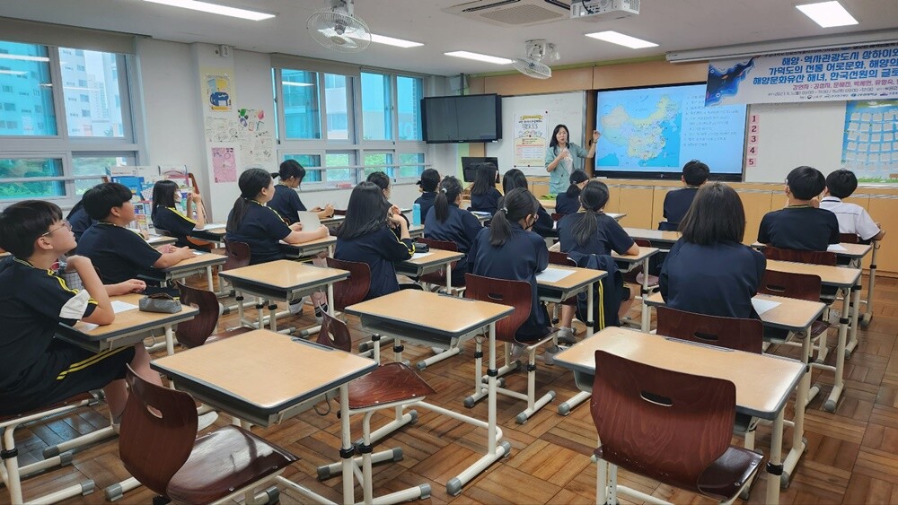 부경대가 5일 분포초등학교와 부흥중학교를 직접 찾아 특별 강연을 제공하는 ‘2023 청소년 해역인문학 강연’을 하고 있다. 사진=부경대 제공