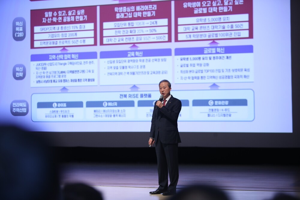양오봉 전북대 총장이 시민설명회에서 ‘전북대 글로컬대학30 사업’ 세부 실행 계획에 따른 남원글로컬 캠퍼스 추진 계획을 발표하고 잇다. 사진=전북대 제공 |