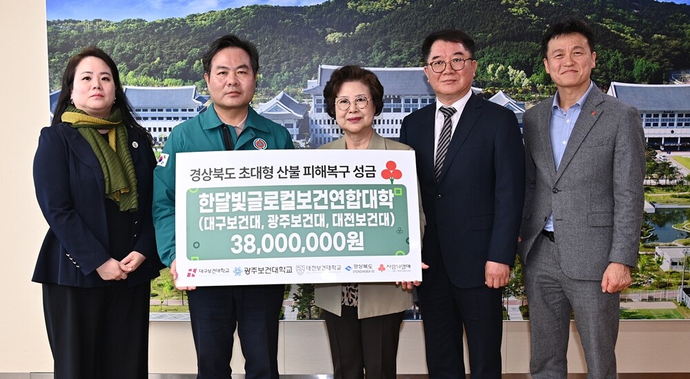 글로컬대학 대구보건대학교는 10일 경북도청 행정부지사실에서 사단법인 한달빛글로컬보건연합대학(대구보건대·광주보건대·대전보건대)과 함께 경북 산불 피해 복구와 이재민 지원을 위해 모금한 성금 3,800만원을 경상북도에 전달했다.