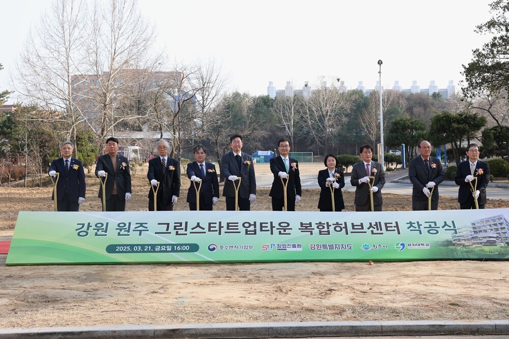 [대학저널 온종림 기자] 상지대학교 부지 내에 조성될 ‘강원 원주 그린스타트업타운 복합허브센터’의 착공식이 21일 대학 예지관 앞에서 열렸다.