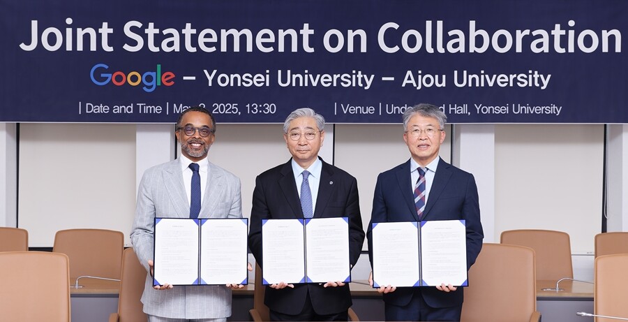 [대학저널 온종림 기자] 연세대학교가 Google, 아주대학교와 함께 인공지능(AI) 분야의 전략적 협력을 위한 공동선언에 합의했다. 이번 선언식은 8일 연세대 신촌캠퍼스에서 열렸으며, 윤동섭 연세대 총장, 크리스 터너 Google 부사장(Vice President), 최기주 아주대 총장을 비롯한 교내외 주요 인사들이 참석해 자리를 함께했다.