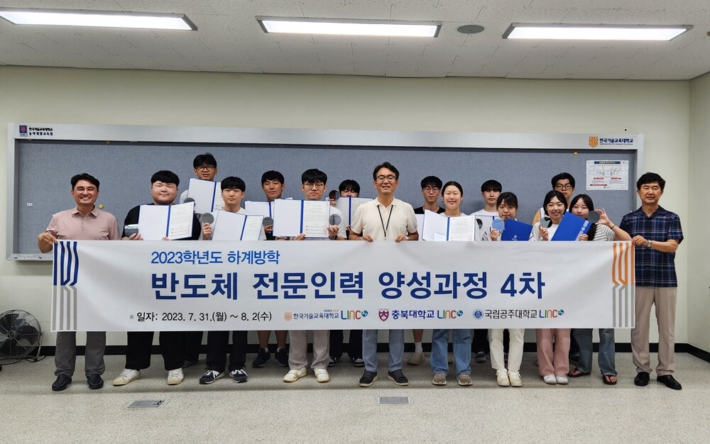 [대학저널 온종림 기자] 한국기술교육대학교는 3단계 산학연협력 선도대학 육성사업단이 지난 2일 한기대와 충북대, 공주대 학생 13명이 참여한 2023학년도 하계방학 ‘반도체 전문인력 양성과정 4기’ 수료식을 했다고 3일 밝혔다.