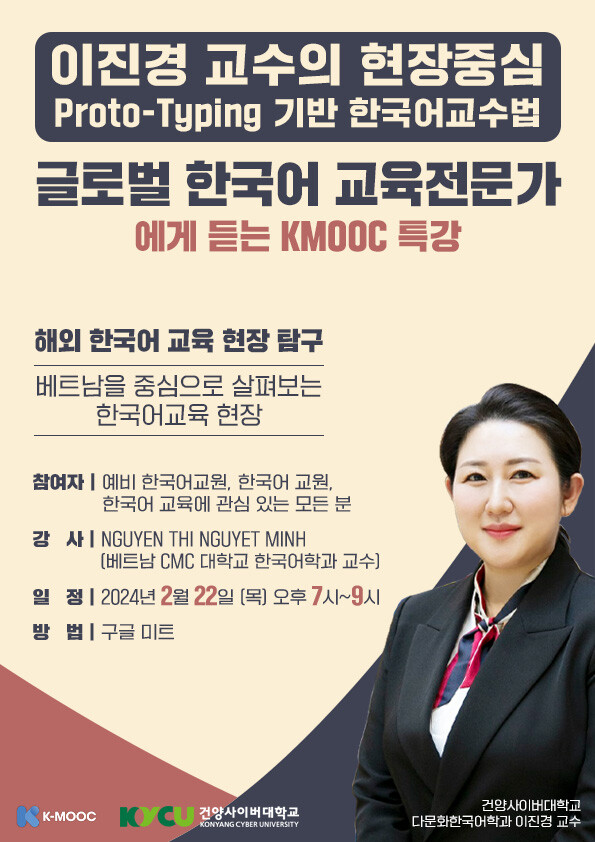 이진경 교수는 “한국어교육 분야에 있어서 한국어 교원의 역량과 학습 정보를 폭넓게 탐색, 개발, 활용해 볼 수 있는 기회가 제공되기는 어려운 실정”이라며 “그런 측면에서 이번 특강은 예비 한국어교원과 현장에서 활동 중인 한국어교원이나 관계자들에게 현장의 전문적이고 체계적인 이해와 지식을 배우는 기회가 될 것”이라고 말했다.
