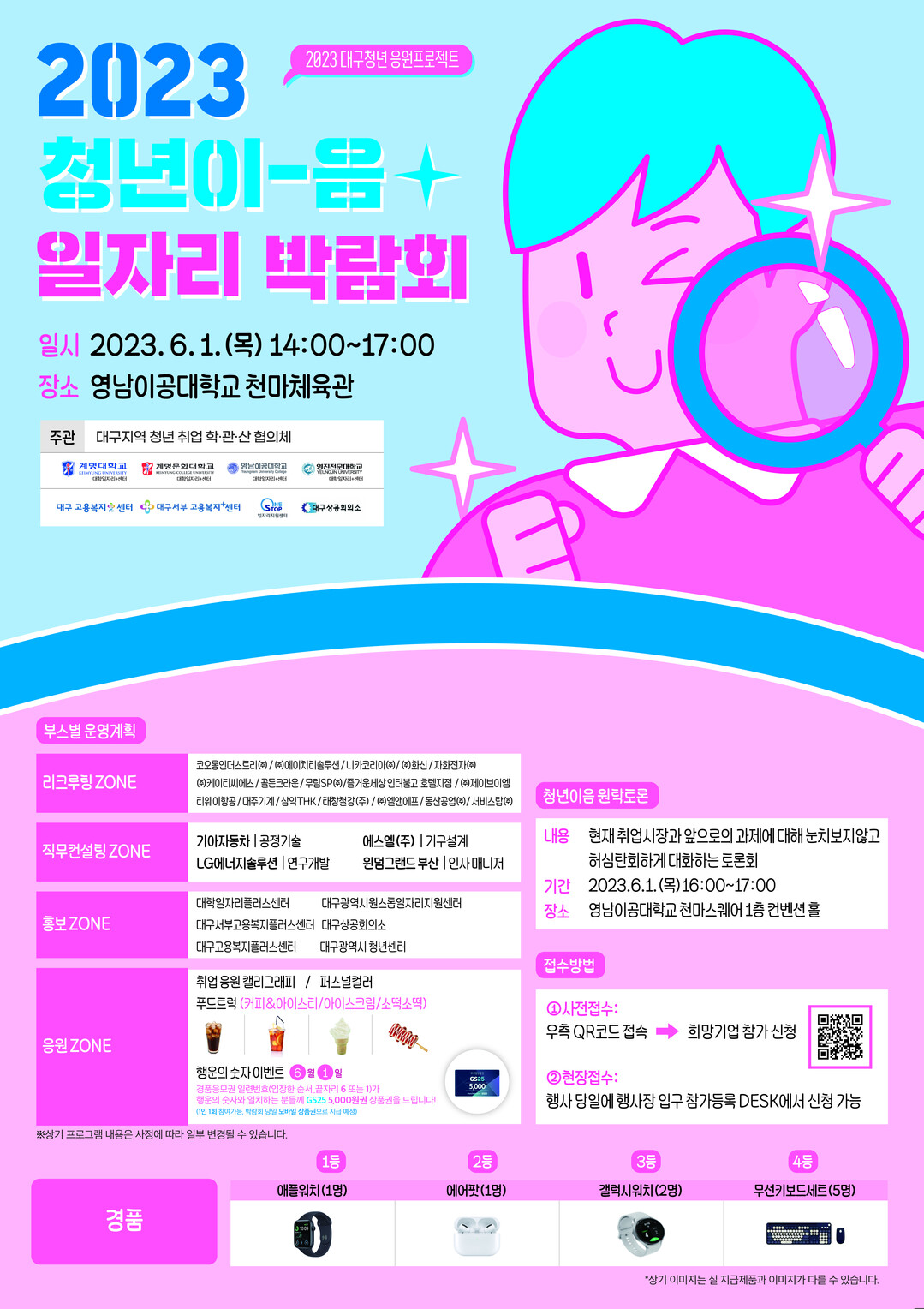 리쿠르팅 ZONE에선 기업 인사담당자와의 취업 상담 및 현장 리크루팅을 진행한다. 코오롱인더스트리㈜, 에이치티솔루션, 니카코리아㈜, ㈜화신, 티웨이항공, ㈜엘앤에프 등 17개 기업이 참여한다.