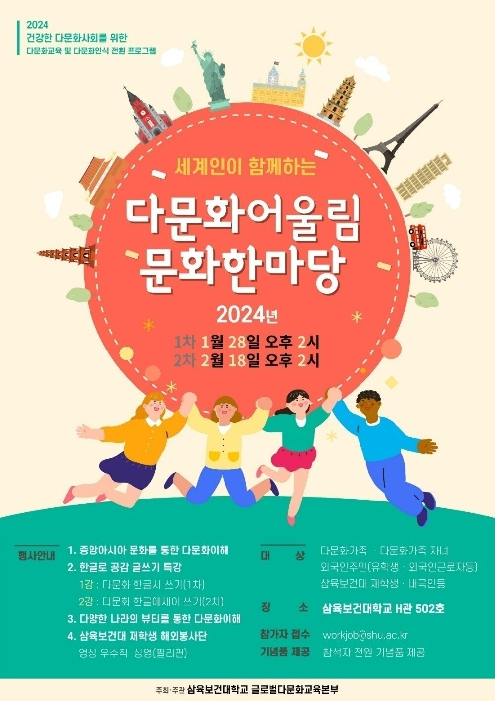 28일 행사의 1부 특강은 한글로 공감 다문화 글쓰기(이동조작가 · 아이디어코리아대표), 다양한 나라의 뷰티를 통한 다문화이해(홍은주교수 · EJ 바디아트연구소 소장), 중앙아시아 문화를 통한 다문화 이해(다문화가족 · 카자흐스탄 디나라)라는 내용으로 삼육보건대 H관 502호 강의실에서 오후 2시부터 3시 40분까지 개최된다. 참여대상은 삼육보건대학교 학생, 다문화가족 자녀, 외국인근로자, 외국인유학생, 외국인주민, 내국인 등이다.