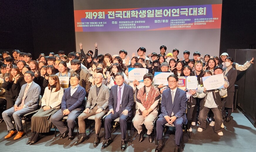 건국대 일어교육과 원어연극 동아리 이치코이치에 팀이 18일 수림아트센터에서 열린 전국 대학생 일본어 연극대회 본선에서 단체 최우수상과 남자 부문 최우수 연기상을 수상했다. 사진=건국대 제공 |