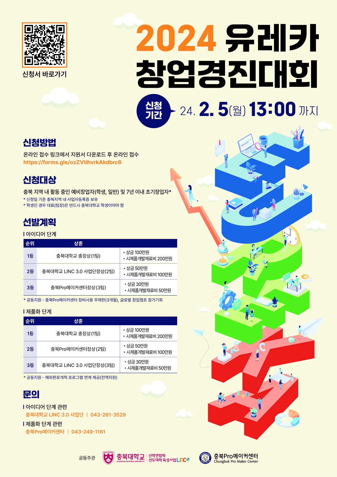2월 5일 오후 1시까지 참가자를 모집하며, 신청을 원하는 학생은 충북대 홈페이지 내 공지사항이나 LINC 3.0 사업단 홈페이지 및 충북Pro메이커센터의 홈페이지를 참고한 후 온라인 접수 링크를 통해 신청하면 된다. 이 밖에 자세한 사항은 충북대 LINC 3.0 사업단과 충북Pro메이커센터로 문의하면 된다.