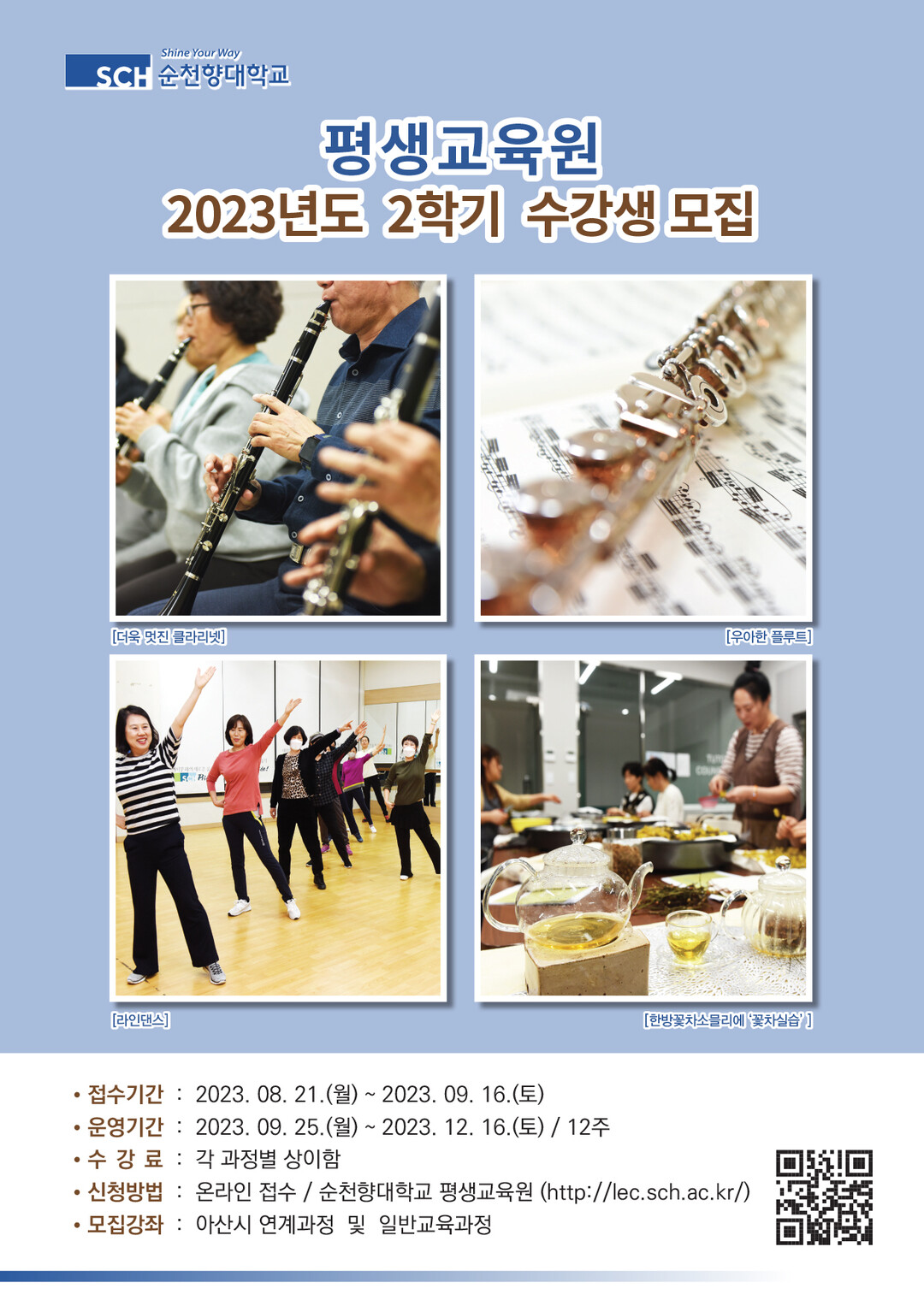 등록 기간은 오는 16일까지 선착순 모집이며, 순천향대 평생교육원 홈페이지 공지 사항을 통해 모집 관련 상세 내용을 확인할 수 있다.