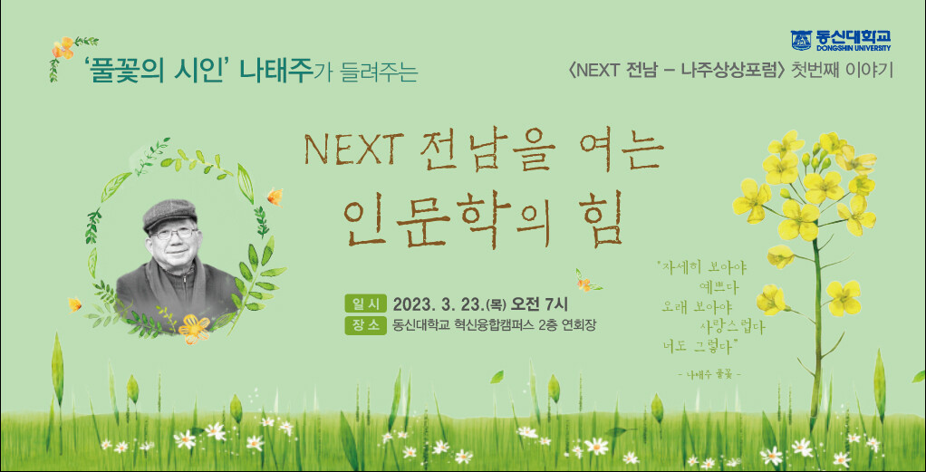 동신대가 주최하는 23일 제1회 포럼은 첫 초청 강연자로 나태주 시인이 나서며 ‘NEXT 전남을 여는 인문학의 힘’을 주제로 NEXT 전남과 나주를 열어가기 위해 인문학적 사고력을 키우는 방법 등을 강의한다.