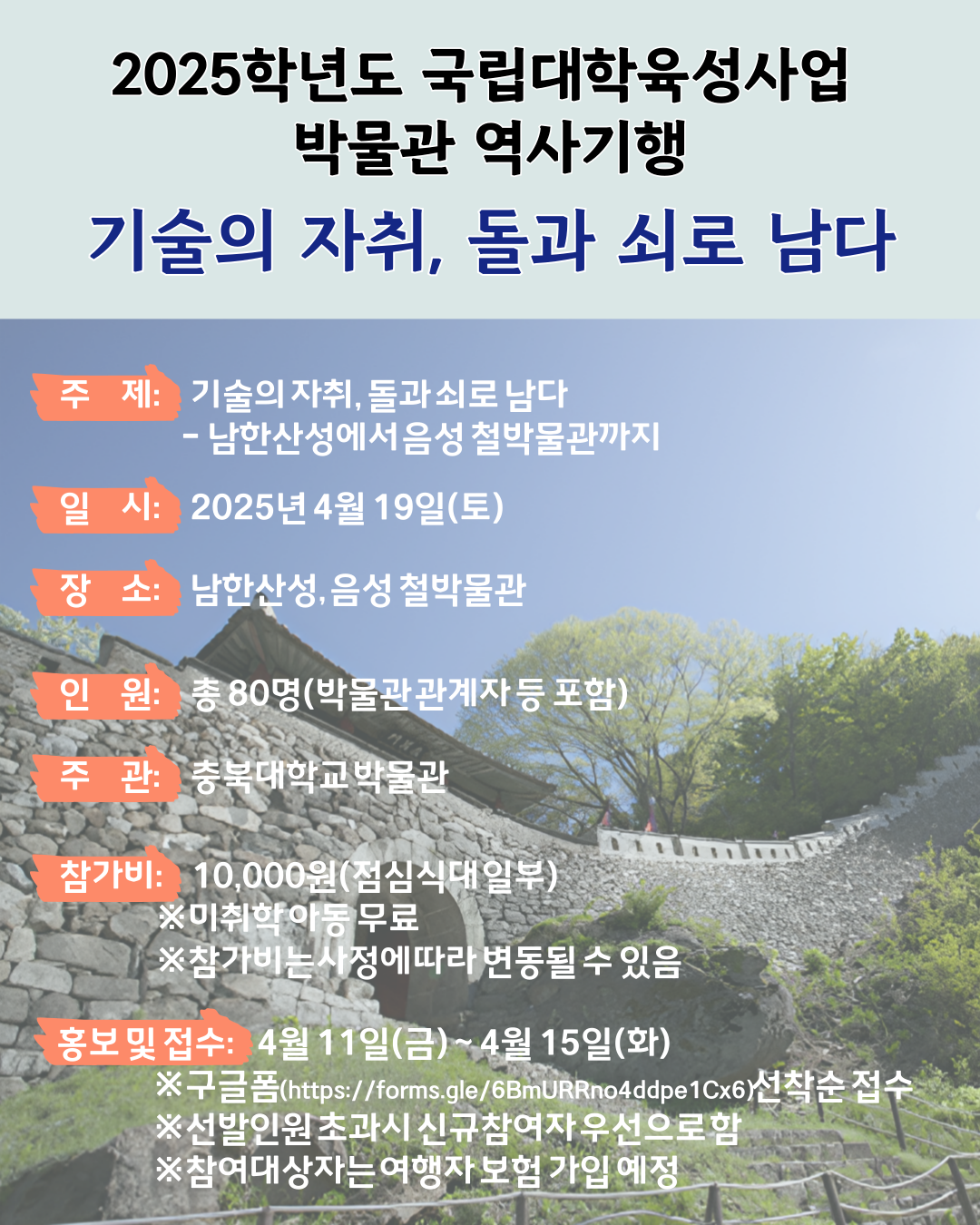 학내 구성원 및 직계·형제 가족을 대상으로 진행되는 이번 역사기행은 ‘기술의 자취, 돌과 쇠로 남다’를 주제로 오는 19일 오전 8시 30분에 출발해 남한산성과 음성 철박물관 등을 탐방한다.