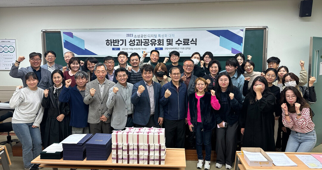 지난 10월 26일 진행된 성과공유회에서 소상공인 교육생과 관계자들이 단체기념촬영하고 있다. 사진=건양사이버대 제공 |