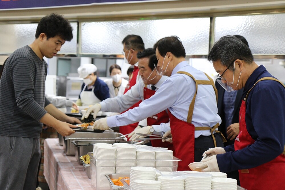 충북대 고창섭 총장과 본부 보직자 등이 23일 선착순 500명에게 무료 저녁밥을 배식하고 있다. 사진=충북대 제공 |