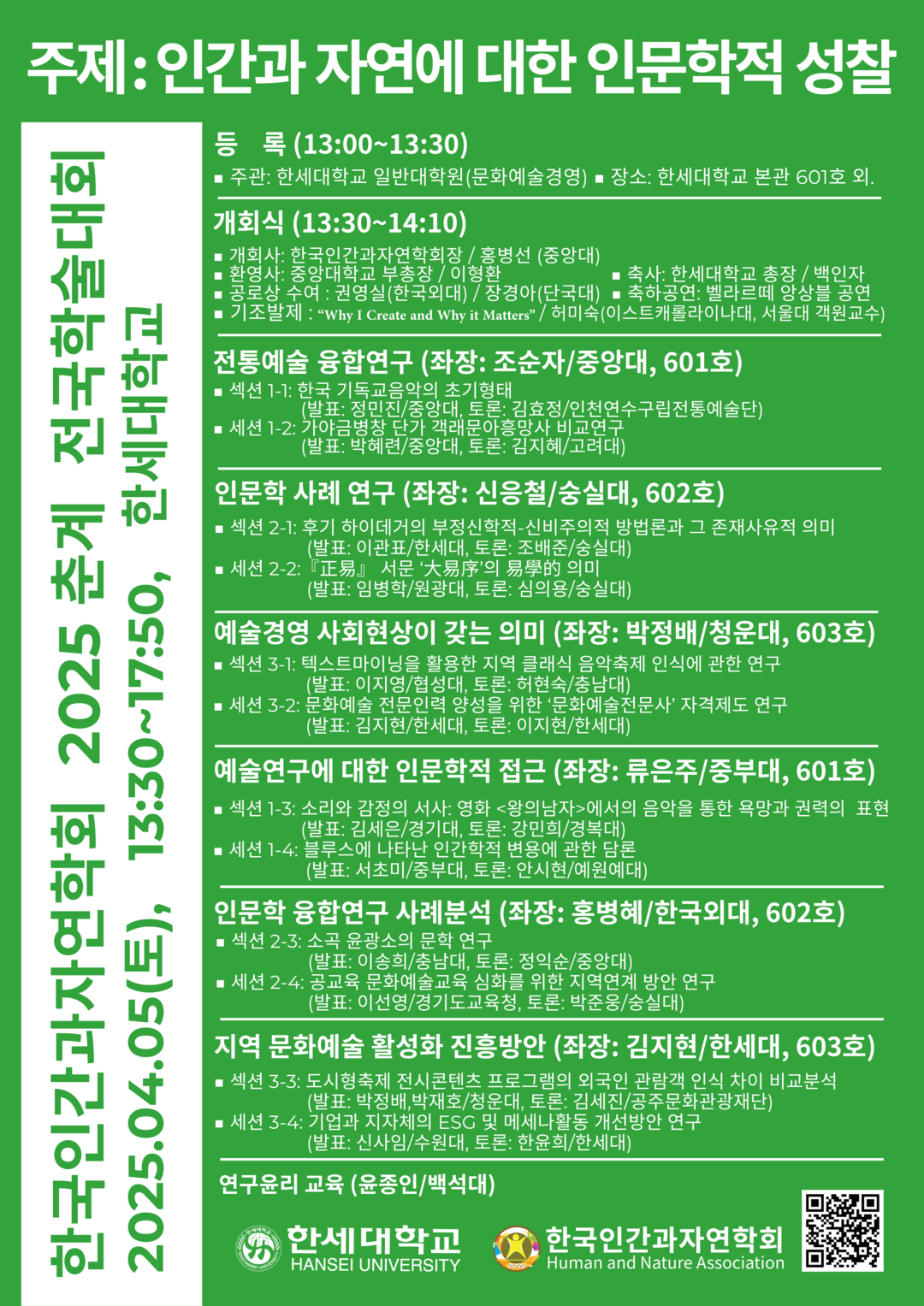 2025년 한국인간과자연학회 춘계 전국학술대회는 미국 이스트캐롤라이나대학교 및 서울대학교에 재직 중인 허미숙 객원교수의 'Why I Create and Why it Matters' 기조발제와 벨라르떼 앙상블의 축하공연 등의 개회식을 시작으로, 전통예술 융합연구(좌장: 조순자 중앙대), 인문학 사례 연구(좌장: 신응철 숭실대), 예술경영 사회현상이 갖는 의미(좌장: 박정배 청운대), 예술연구에 대한 인문학적 접근(좌장: 류은주 중부대), 인문학 융합연구 사례분석(좌장: 홍병혜 한국외대), 지역 문화예술 활성화 진흥방안(좌장: 김지현 한세대) 등 다양한 분야별 주제로 발표와 토론이 준비될 예정이다.