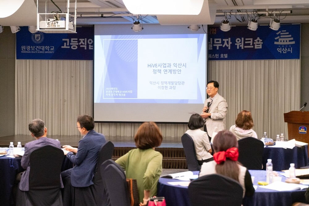 고등직업교육거점지구(HiVE)사업 실무자 워크숍에서 익산시 정책개발담당관 이창연 과장이 특강을 하고 있다. 사진=원광보건대 제공 |
