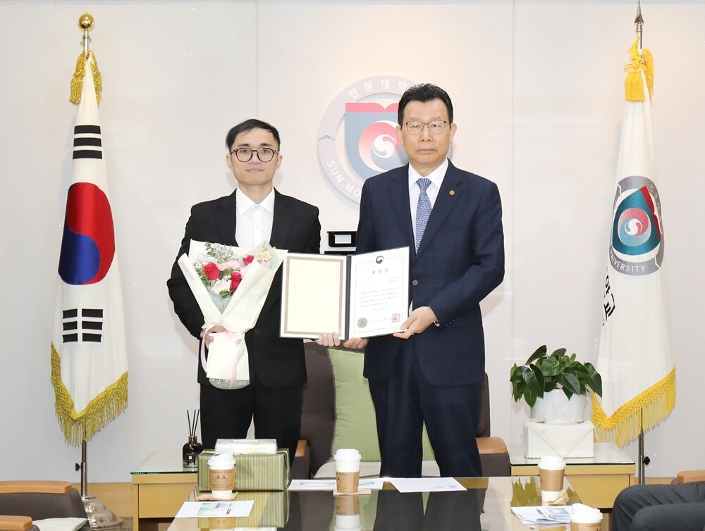 BK21 사업 최초 인문학 분야 외국인 유학생으로 교육부 장관 표창을 받은 팜흐웅쭝 학생(왼쪽)과 선문대 문성제 총장. 사진=선문대 제공 |