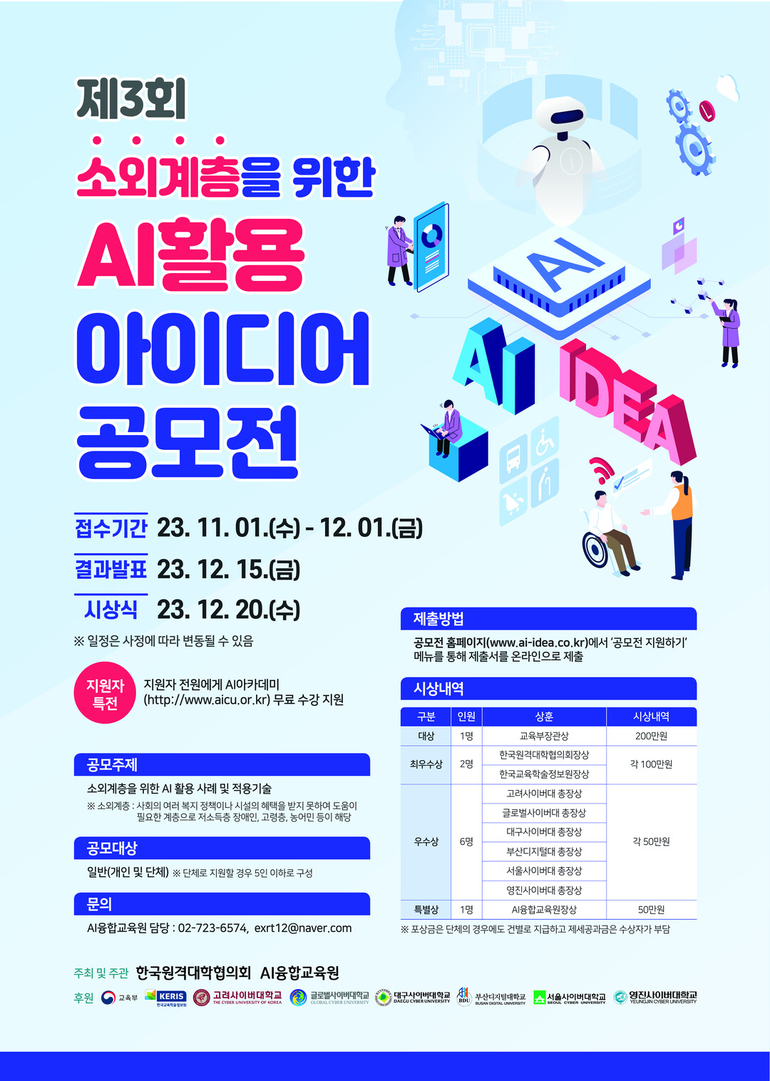 AI융합교육원 박형용 원장(글로벌사이버대 AI미래융합학부 교수)은 “AI 기술은 나날이 발전하고 있지만 소외계층을 위한 AI 기술 활용도는 아직도 미비한 것이 현실”이라며 “소외계층을 위한 참신하고 실용적인 아이디어가 실용될 수 있도록 많은 관심과 참여를 부탁드린다”고 말했다.