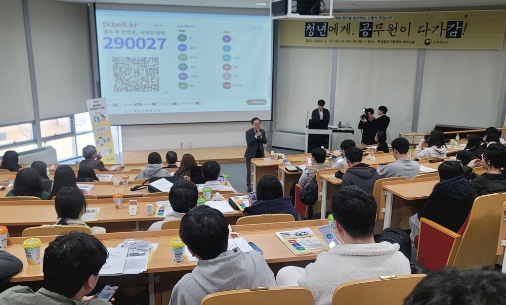 1부 행사는 ‘토크 라운지’를 통해 인사혁신처 사무관이 인사혁신처 소개를 비롯해 ▲공직의 매력과 가치, ▲청년의 공직 선호도, ▲공직의 강점과 약점, ▲공무원 위상 강화를 위한 인사처의 노력 등을 설명했다.