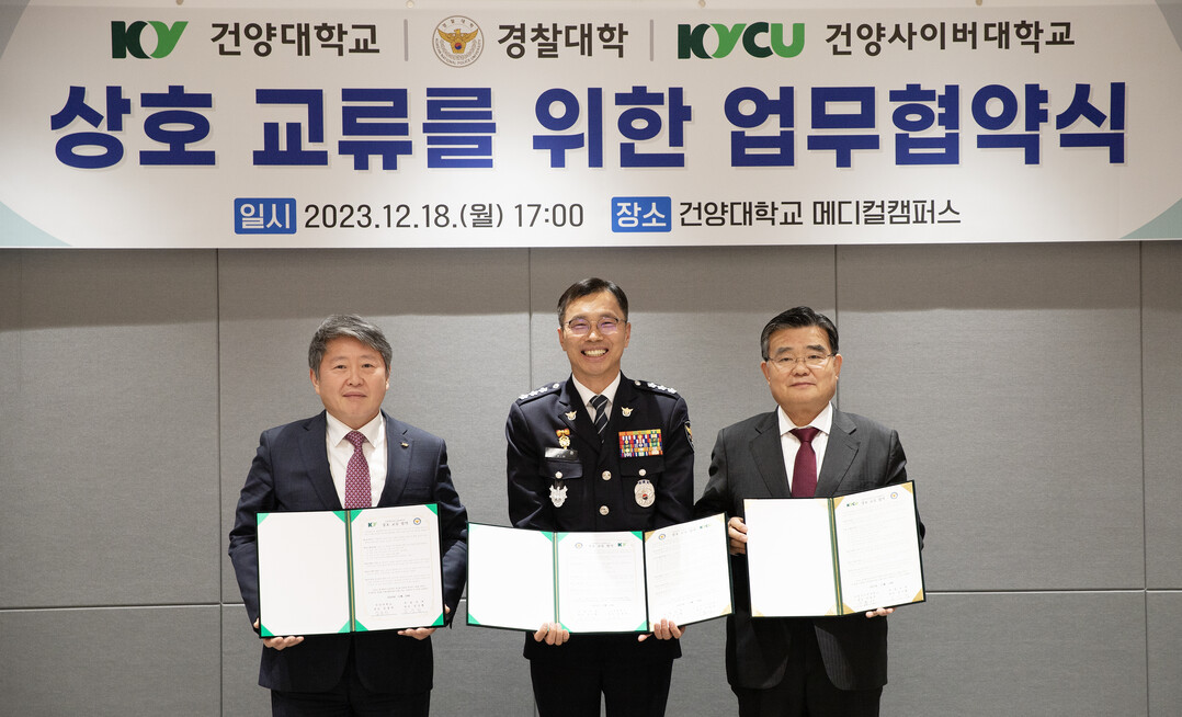 [대학저널 온종림 기자] 건양사이버대학교과 건양대학교, 경찰대학이 ‘상호발전을 위한 협력 및 교류 활성화’를 위해 18일 건양대 대전메디컬캠퍼스 내 죽헌정보관에서 업무협약을 체결했다.