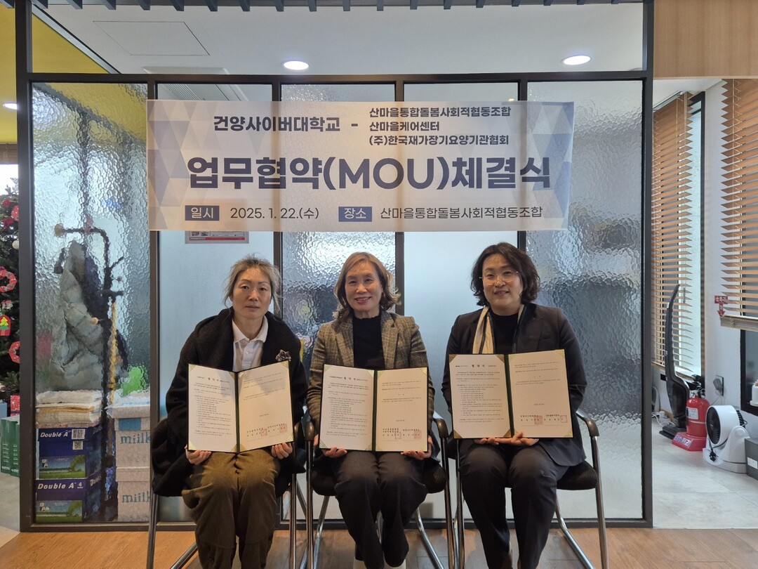 [대학저널 이선용 기자] 건양사이버대학교 사회복지상담학과는 지난 1월 22일 오후 3시 산마을통합돌봄사회적협동조합·산마을케어센터, (사)한국재가장기요양기관협회 대전지부와 업무협약을 체결했다고 24일 밝혔다.