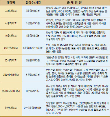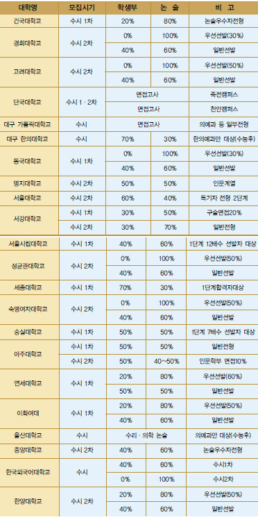 <표1>에서 보듯 주요 대학 수시모집에서 고려대, 성균관대, 경희대, 동국대, 숙명여대는 논술고사 성적 (100%)만으로 모집 인원의 30~50%를 우선선발하며 연세대, 이화여대, 한양대의 우선선발에선 논술고사 비중 이 80%에 달한다. 주요 대학을 마음에 두고 있는 학생이라면 외면할 수 없는 추세인 것이다.