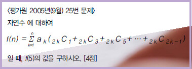 해당 문제는 하나씩 일일이 대입해서 정리하면 답이 나오겠지만, 당연히 그보다 간단한 방법이 있다. 일단 이 문제는 ‘∑’와 ‘조합의 성질’과 관련된 ① 통합영역 문제다. 통합영역 문제가 어렵다고 하지만, 실제 문제와 관련된 각 영역의 개념만 알고 있으면, 오히려 간단하게 풀리는 경우가 많다. 『수열』단원에서 배우겠지만, 우선 ∑ 뒤에 오는 것은 그것이 어떤 형태이든 수열의 ‘일반항’으로 생각하면 된다. 이를 바탕으로 조금 눈치가 빠르면, 시그마 뒤에 있는 조합의 합들이 간단하게 정리되어 일반항으로 바뀔 것이라는 것을 알 수 있다. 실제 문제를 처음 보고 ‘② 조합의 합들이 간단히 정리될 것 같은데’ 라는 느낌을 가지는 것도 쉬운 일은 아니다. 그런 느낌을 가졌다면, 문제를 대하는 감각이 있다고 할 수 있다. 중요한 것은 그 다음 단계인데, 도대체 어떻게 조합의 합들을 간단히 할 것인가? 여기에 바로 이 문제의 포인트가 있다. 바로 이항계수의 ‘성질’이 적용되어야 한다. (단, 이항계수의 성질이 나왔을 때는 첨자에 주의해야 한다.)