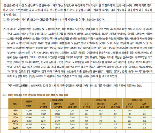 “제시문 [나]에 제시된 <표1>에서는 유년인구는 감소하는 반면 노인인구는 증가하는 인구변화 추이를 통해 노인부양에 대한 사회적 부담이 커질 것이라는 사실을 보여주며, <표2>의 자료는 노인 부양 주체에 대해연령층마다 다른 생각을 가지고 있다는 점을 보여준다. 대체적으로 가족이 담당해야 한다고 생각하지만 젊은 층보다 주로 40대 이후의 연령층에서 가족의 부양을 더 지지하였고, 이와는 다르게 20~30대의 젊은 층은 가족뿐만 아니라 정부와 사회가 부양을 함께 담당하여야 한다고 생각하였다. 젊은 층일수록 가족과 정부와 사회가 담당해야 한다고 생각하는 사람들이 많아지고 있다는 사실은 시대의 변화에 따라 정부와 사회가 노인 부양의 책임을 공동으로 져야한다는 의식이 증가하고 있음을 나타낸다. 따라서 지문 [가]에서 드러난 바와 같이 고령화 사회에서의 노인문제는 더 이상 유교적 가치관에 기초한 개별 가족의 문제로 간주하기보다는 국가의 적절한 사회보장제도에 의한 접근이 필요하다는 점을 주장할 수 있다.”이게 출제교수의 시선이다. 주어진 도표 자료에서 읽어내야 할 의미를 함께 느껴보아야 한다. 흔히 비 텍스트 자료 중 표는 그래프에 비해 학구적인 분석력을 점검하기에 적당하다고 말한다. 대개 하나의 분명한 특