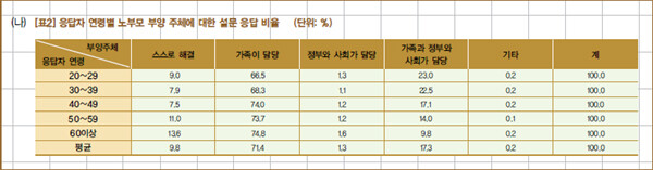 그것은 제시된 (나)의 표를 보아도 알 수 있는 사실이다. 여성의 사회활동으로 유년 인구는 점차 감소하고 경제성장으로 생활이 나아짐에 따라 평균수명이 늘어 노년인구는 점차 증가하는 것을 <표1>을 통해 알 수 있다. 그런데, 이러한 노령화로 인한 노부모 부양비를, 제시문 (나)가 주장한 것처럼, 국가가 부담해야 한다는 의견이 점차 증대되고 있다. <표2>를 보면, 응답자가 젊을수록 가족이 부양비를 부담해야 한다고 응답한 비율은 줄어들고, 가족뿐만 아니라 정부와 사회 또한 담당해야 한다고 답한 비율은 늘고 있다.