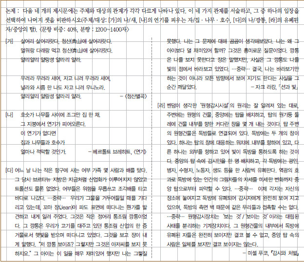 대개 이런 정도가 되겠다. (가)의 관계는 주체와 대상이 서로 구별되지도 않고 있는 미분화 상태라고 할 수 있겠지. 상대를 상대로서 알지 못하면 상대와 건강하고 바람직한 관계 설정도 되지 않는 것이니 이 관계를 선택하면 오답이 된다. (나)의 관계는, 전형적인 근대 서구적 세계관에서 보이는 주체와 대상의 관계다. 연기를 피우는 자가 일방적으로 대상들에 영향을 미치는 관계인 것. 주체의 선의가 문제가 아니라, 일방성이 문제인 거다. ‘적막할 것’이란 느낌은 인간의 일방적인 해석일 뿐이란 말이다. (다)의 관계는 새로운 깨달음을 보여주고 있다. “깡통 또한 나를 보고 있다”는 인식 말야. 한갓 보잘것없는 사물도 나와 대등한 존재라는 성찰이 담겨 있는 글이다. 이렇게 말할 수 있겠네. ‘주체와 대상이 대등하게 상호작용하는 쌍방향적 관계’라고 말야. 그럼 (라)의 관계는 뭘까? ‘주체와 대상의 지위가 전도된 가장 위험한 관계’라고 할 수 있겠지. 이 대목에서 말해 두는데, 이 논제는 매우 친절하게도 문제 끝 부분 괄호 글에서 주체와 대상을 알려주고 있었단다. 주체는 ‘유폐된 자’이고, 대상은 ‘중앙의 탑’이라고 말야. 확인해 보길. 그렇지? 그런데도, 이 논제에 답한 글들을 보면, 30% 가까운 글들이 (라)의 주체를 ‘중앙의 탑’이라고 쓰고 있단 말이야. 당연히 큰 감점을 당하겠지?