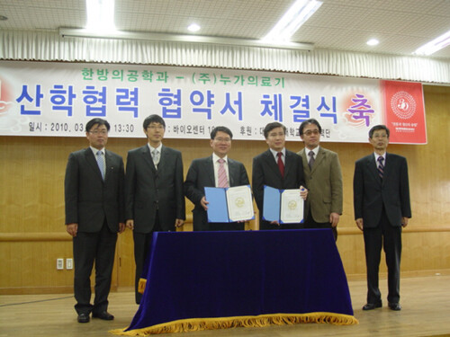 대구한의대 한방의공학과와 (주)누가의료기 간에 산학협력 협약식 행사가 3월 24일 오후 바이오센터 105호실에서 있었다. 산학협력협약식 행사에는 한방의공학과 교수님들과 학생들이 참석하였으며, 산학협력 협약 체결후 (주)누가의료기 이종수 부대표의 회사소개 특강이 있었다.