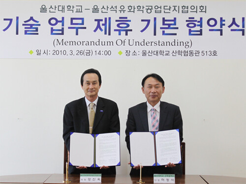 울산대학교 산학협력단(단장 허정석)과 울산석유화학공업단지협의회(회장 강신욱)가 26일 오후 2시 울산대학교 산학협력단 회의실에서 울산석유화학공단 내 폐수종말처리시설 설치사업과 관련, 운영원가 산정 및 운영관리 방안 협력을 위한 양해각서(MOU)를 체결했다.