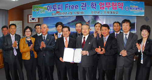 우석대학교(총장 라종일)와 진안군(군수 송영선)은 13일, ‘아토피 없는 나라 만들기’ 프로젝트에 관한 협약을 체결하고 본격적인 활동에 들어갔다. 진안군청 2층 상황실에서 열린 이날 협약식에는 라종일 우석대 총장, 서동석 산학협력단장, 송정모 우석대의료원장, 송영선 진안군수, 송정엽 군의회의장, 배병욱 군의회 전문위원, 조준열 보건소장, 김남기 전략산업과장 등 양 기관 관계자 30여명이 참석했다. 주요 협약 내용으로는 △아토피 등 환경성 질환에 대한 한방치료 및 한의약 케어 분야에 대한 교육 콘텐츠 개발 △한방 치료약품 개발 및 관련 산업분야 공동 연구지원 △진안군 한의약공공보건사업 지원 △인재육성 프로그램 지원 및 공동참여 △아토피프리 클러스터 구축을 위한 상호협력 등이다. 이날 협약 체결에 따라 우석대는 우석대의료원을 중심으로 한의약 분야와 한방산업 육성 및 우수인력 개발을 위해 진안군과 네트워크를 구축, 국민건강과 국가발전에 기여하게 된다.