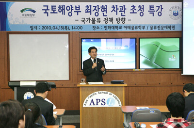최장현 국토해양부 제2차관이 15일 오후 인하대(총장·이본수)를 방문하여 ‘2010년 국가물류 및 국토해양 정책 방향’에 대한 특별강연을 가졌다. 최 차관은 글로벌 경쟁력을 갖춘 종합물류체계를 구축하기 위한 국가물류정책 추진 방향으로 △물류산업 경쟁력 강화 △철도화물 수송체계 개선 △저비용 항공물류서비스 제공 △해운산업 위기 조기 극복 및 신성장전략 수립 △항만물류산업 활성화 △저탄소 녹색물류 본격 추진 등을 제시했다.