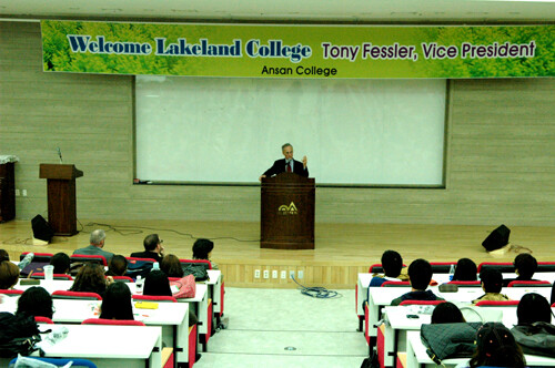 안산1대학(총장 김득중)은 지난 28일, 성실관 세미나실에서 미국 Lakeland 대학 Tonny Fessler 부총장 초청 특강을 가졌다. 양 대학간 협력 사업에 대한 소개를 중심으로 진행된 특강에는 관광영어과 재학생 100여명과 교수진, 해외 편입학에 관심있는 졸업생까지 약 250여명이 참여해 최근 해외진출에 대한 높은 관심사를 고스란히 대변했다.