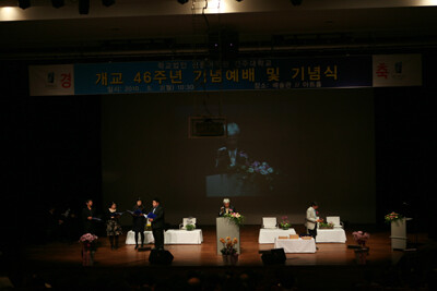전주대(총장 이남식)는 5월 3일(월) 오전 10시 30분 JJ아트홀에서 교직원 600명이 참석한 가운데 개교 46주년 기념 예배 및 기념식을 개최했다. 제1부 기념예배에는 장선철 처장의 사회로 시작하였으며, 음악학과 학생들의 특송, 김승수 목사의 ‘새로운 시작’이란 제하의 설교가 있었다.