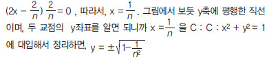 위 상황은 In을 구하지 못해서, 즉 식 생성이 불가능하여 문제를 못 풀게 된 것이다. 문제를 보면 알겠지만, ≪수학 10-나[수학 (하)]≫의 원의 방정식 부분과 ①통합영역으로 출제되었다. (여기서부터 좌절인 경우도 많을 것이다.) 일단 길이 을 구하려면, 두 교점을 알아야 되는데, 그림에서 보듯이 공통현의 방정식이 두 교점을 지나니까, 공통현 방정식을 구해서 한 원과 연립하면 교점 좌표를 구할 수 있다. 우선 ②공통현 방정식을 구하는 것이 문제인데, ≪수학 10-나(수학 (하)≫에 나오는 공통현 방정식에 관한 공식을 모르면 식을 세울 수 없다. 두 원을 빼서 이차항을 없애면, 공통현의 방정식이 나온다. 즉 C - Cn해서 정리하면,