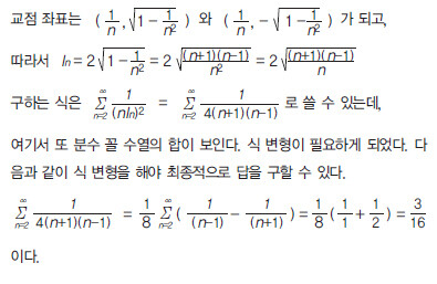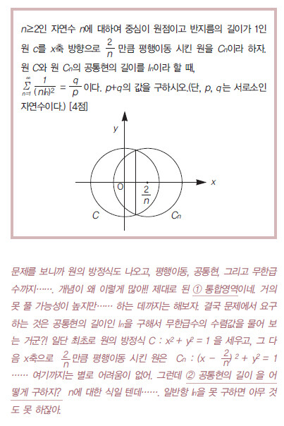 이 문제는 결국 공통현 방정식을 구하는 공식을 몰라서 ln을 생성하지 못했고, 그래서 풀지 못하게 된 것이다. 기본적으로 무한급수 문제인데, 원의 방정식 관련 이론을 개입시켜 통합영역 문제로 구성한 것이다. 마지막에는 또 다시 분수 꼴 수열의 합 개념을 넣어서 끝까지 괴롭히고 있는 문제라고 할 수 있다. ‘식 생성 등’과 관련하여 발생하는 문제점 ‘식의 생성 등’을 해야 하는 단계는 문제에 대한 분석 과정이 꽤 이루어진 상태라 할 수 있다. 즉 조금만 더 진행하면 결론을 도출할 수 있게 된다. 그런데 어려운 문제들은 대부분 이 단계가 상당히 까다롭게 구성되어 있다. 필수 문제에 어느 정도 자신감이 생긴 이후 조금 어려운 문제를 접했을 때, 문제풀이가 잘 안 되어 좌절한 경험이 있을 것이다. 그러한 문제점의 가장 근본적인 부분이 바로‘식의 생성 등’의 단계가 제대로 해결되고 있지 못하기 때문이다.