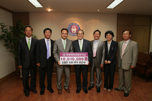미국에서 변호사로 활발한 활동 중인 김철민 전북대 동문(법학과 99년 졸업)이 5월 31일 오전 11시 30분 모교를 찾아 대학 경쟁력 향상을 위해 써달라며 발전기금 1천만 원을 쾌척했다. 김 변호사는 최근 영국 QS사의 아시아대학평가에서 전북대가 국내 14위, 아시아 92위에 랭크되는 등 급속도로 발전하는 모교에서 후배들이 더욱 큰 역량을 발휘할 수 있기를 바라는 마음에서 기금을 내놓기로 했다고.