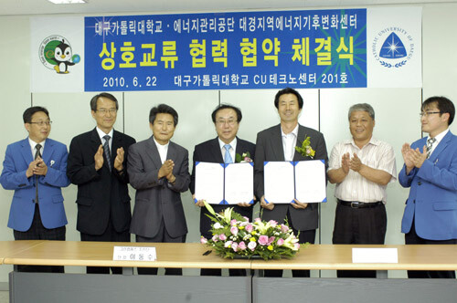 대구가톨릭대학교(총장 소병욱)는 22일 대구가톨릭대 테크노센터에서 에너지관리공단 대경지역에너지기후변화센터(센터장 이선업)와 그린캠퍼스 구현을 위한 교류협약을 체결했다.