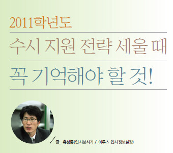 이 점 꼭 명심하기 바란다. 다음은 수험생들이 수시 지원 전략을 세울 잊지 말아야 것들이다. 이들 내용을 바탕으로 필요한 입시 정보들을 챙기고 대비한다면 2011학년도 수시 지원에서 좋은 결과를 거둘 수 있을 것이다.