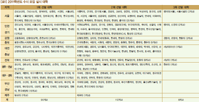 2011학년도 대학입시에서 수시 모집을 실시하는 대학은 가톨릭대·서울대·홍익대 등 196개 대학이고, 이들 대학이 선발하는 신입생은 4년제 대학 전체 모집 정원의 약 60.8%에 해당하는 231,444명이다(미발표 인천대 제외). 이는 2010학년도에 192개 대학에서 227,092명을 모집한 것보다 4개 대학 최소 4,352명이 늘어난 규모이다(인천대를 포함하면 수시 모집 정원은 더 늘어날 것임).
