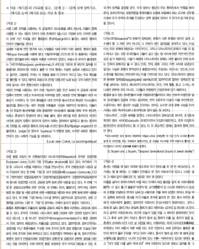 (자료 1)에선두 공동체의 언어가 달라 의사소통을 할 수 없을 때, 이 둘이 결합하여 새로운 형태의 언어인 혼성어가 만들어짐을 보여주고 있고, (자료 2)는 유럽 통합의 특성을 보여준다. 그런데 (자료 1)과 (자료 2)에서의 통합은 말 그대로 둘 이상의 요소가 합쳐지는 것이지만, 통합이 된 뒤에도 두 언어의 형태가 여전히 보이거나 각 회원국의 독립성과 권력이 인정되는 등 본래의 고유성을 보존하는 모습을 보인다. 이 고유의 특성의 보존은 <제시문 B>에서도 확인할 수 있다.