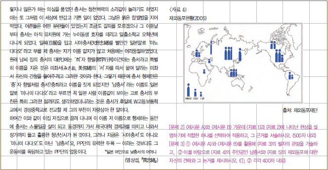 이번 호의 분석 대상 논제가 실례가 될 수 있겠다. 한국인과 일본인 사이에서 태어난 ‘남충서’란 인물과 재외동포에 대한 자신의 견해를 제시하라는 3번 논제가 그러하다. 많은 답안들을 검토해 본 결과 적지 않은 학생들이 출제의도를 짐작하지 못해, 엉뚱한 견해를 거침없이 제시하는 것을 보게 되었다. 참으로 기발한 오답들이 많았다. 한 번 생각해보자.