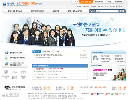 전북대(총장 서거석)는 입학사정관제의 확대 시행에 맞춰 정보 접근의 편리성을 제공하기 위해 홈페이지를 대대적으로 개편했다고 7일 밝혔다.