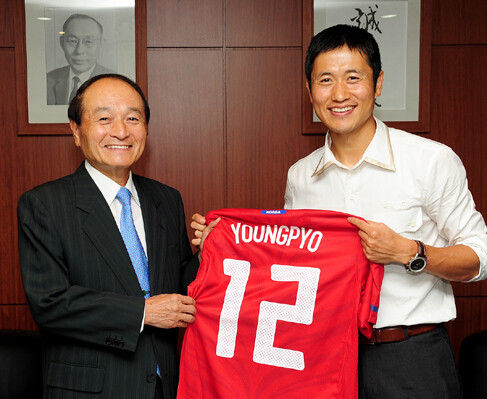 건국대 정치외교학과 96학번인 이영표 선수는 김경희 이사장과 오 명 총장에게 자신의 등번호 12번이 새겨진 유니폼을 선물했다.