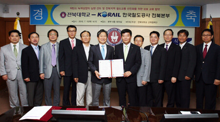 전북대(총장 서거석)가 한국철도공사 전북본부(본부장 최덕률)와 녹색 철도이용 생활화를 통한 저탄소 녹색성장의 실현과 전북지역 철도 교통 선진화를 위해 손을 맞잡았다.