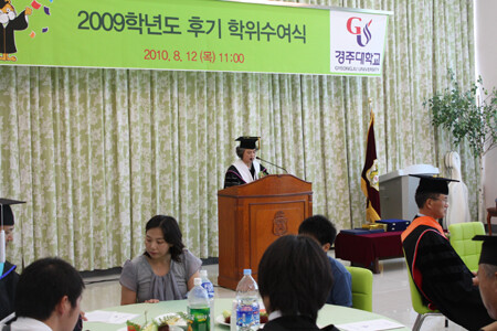 경주대(총장 이순자)는 12일 외식조리동 연회실습장에서 이순자 총장과 설립자, 법인이사, 동문회장을 비롯한 내빈 및 학생․학부모 등 1천여명이 참석한 가운데 학위수여식을 가졌다.