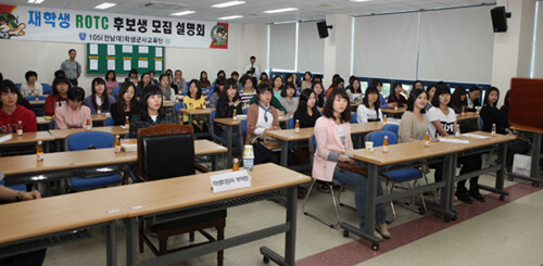 전남대(총장 김윤수) 여성 ROTC 모집 설명회가 30일 오후 4시 전남대 학군단 군사학 강의실에서 개최됐다. 전국 대학 중 처음으로 열린 이날 설명회에는 여성 ROTC에 관심 있는 여학생 및 학부모 100여 명이 참석했으며, 여성 ROTC 소개와 모집요강, 평가방식에 대한 설명이 이어졌다.